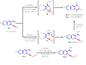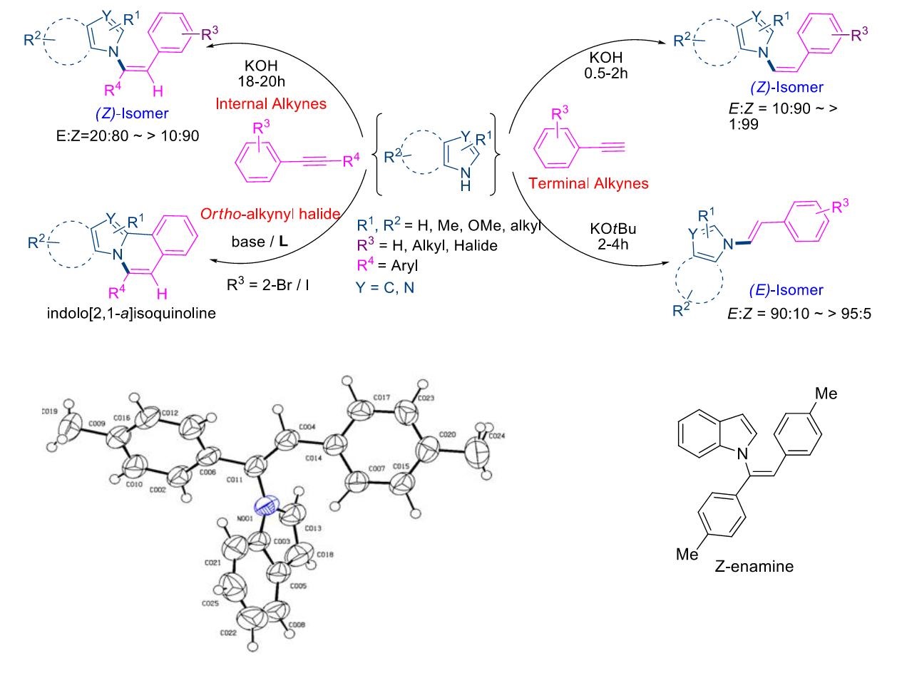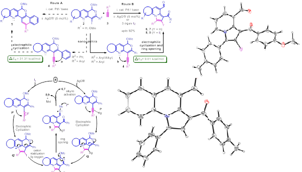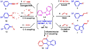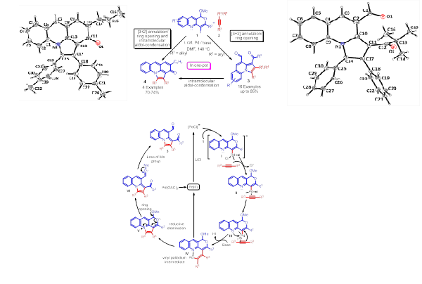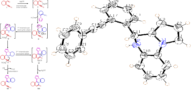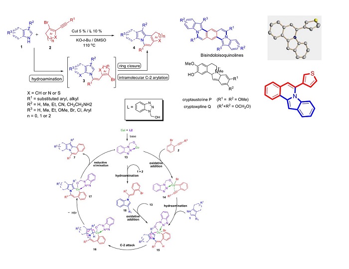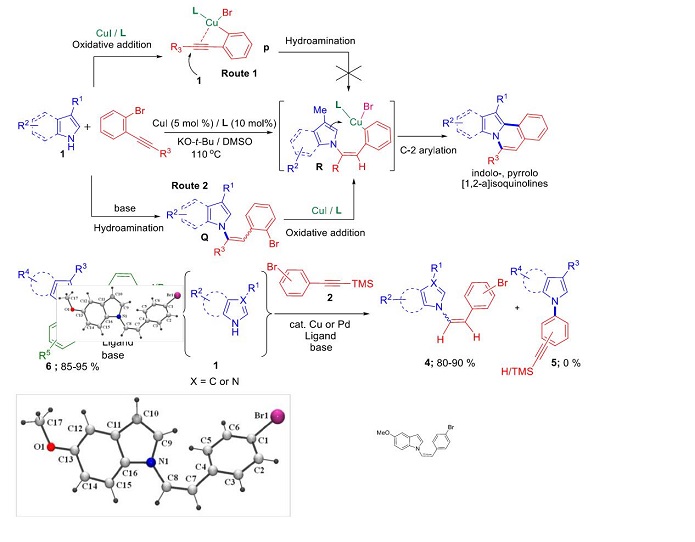 Based on the above results we have designed a novel strategy for the copper-catalyzed tandem synthesis of indolo- and pyrrolo[2,1-a]isoquinolines (core nucleus of natural product, Cryptaustoline and Cryptowoline ) from ortho-haloarylalkynes by sequential intermolecular addition of N-heterocycles onto alkynes, followed by intramolecular ring closure by C-2 arylation. This chemistry involve the preferential nucleophilic addition of indoles and pyrroles onto the ortho-haloarylalkynes over N-arylation of the aryl halide. The proposed mechanism was confirmed by various controlled experiments and X-ray crystallographic studies. Developed novel chemistry can allow direct access of various types of diversely substituted N-heterocycles, carbocycles, natural- products-like compounds, synthetic drugs and π-conjugated organic materials. We proposed two possible routes for the generation of key intermediate 15. i. via oxidative addition followed by hydroamination of intermediate 14. ii. via hydroamination to form enamine intermediate 18 and followed by the oxidative addition.